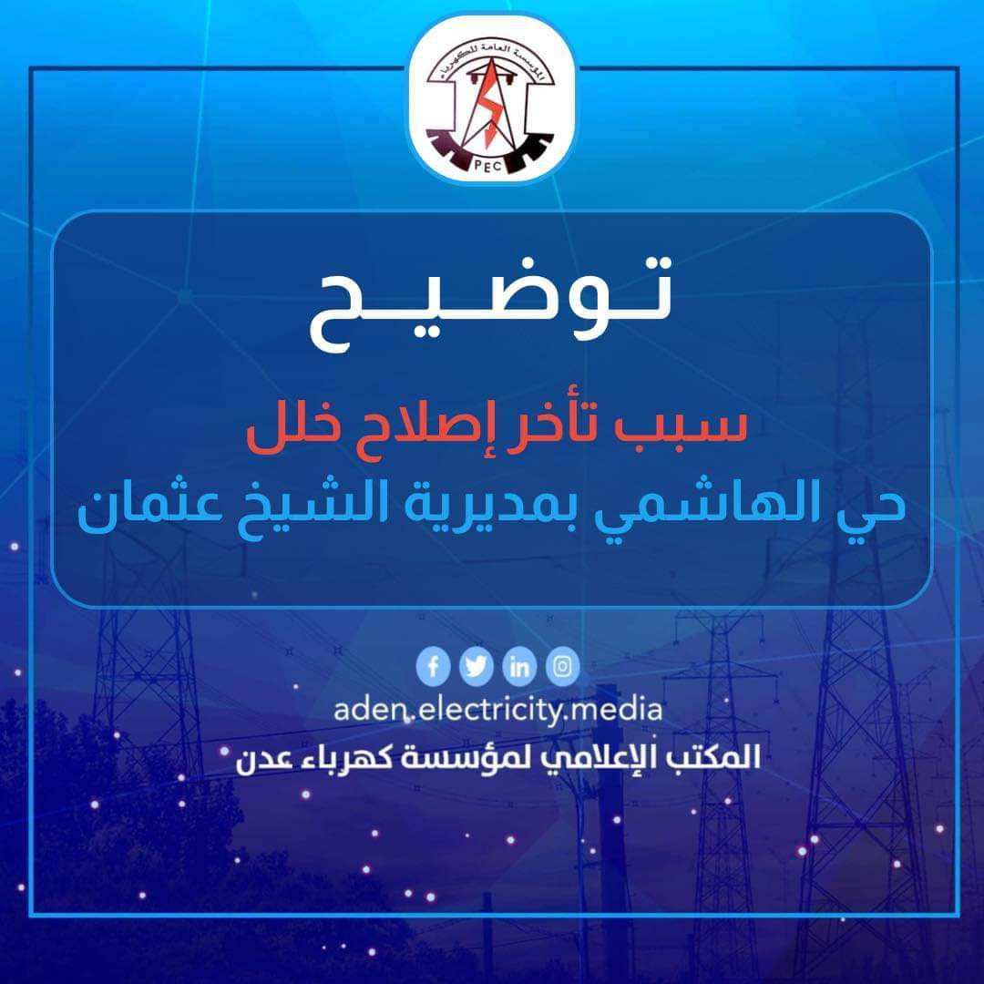 وبهذا الصدد تعبر المؤسسة العامة لكهرباء عدن عن بالغ أسفها لمواطني حي الهاشمي لهذا الخلل الخارج عن إرادتها.