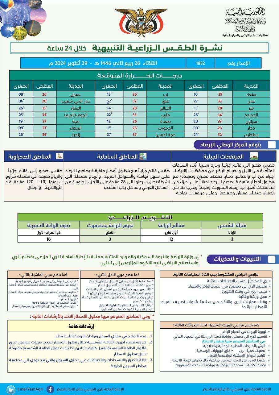 أصدر المركز الوطني للأرصاد نشرة الطقس الزراعية التنموية التي تشمل توقعات الطقس لمدة 24 ساعة بدءاً من الثلاثاء، 29 أكتوبر 2024. النشرة تشير إلى توقعات هطول أمطار خفيفة إلى متوسطة مصحوبة بالعواصف الرعدية على المرتفعات الجبلية وأجزاء من المناطق الساحلية والحدودية، مع درجات حرارة متفاوتة بين مختلف المدن.