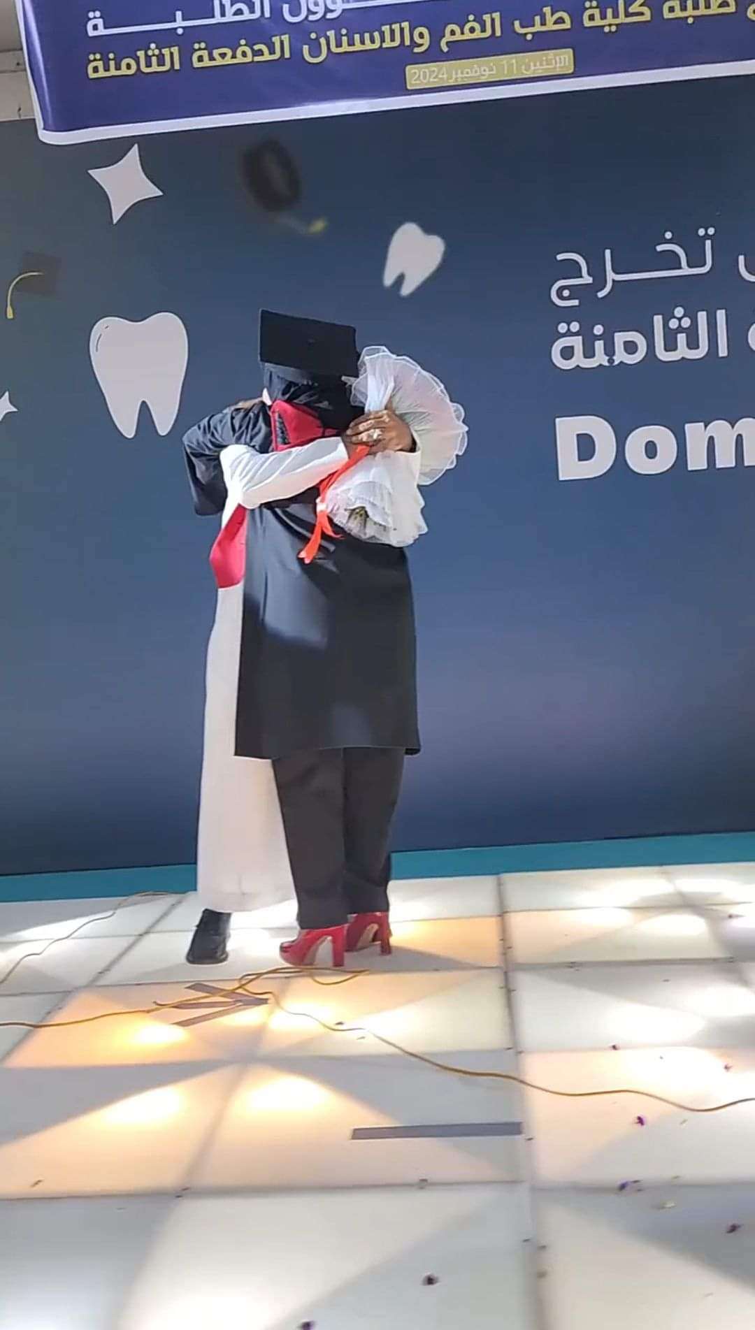 وأفاد شهود عيان ان أب قام بمفاجأة ابنته بحضور حفل تخرجها دون علمها بعد سنوات من الغربة