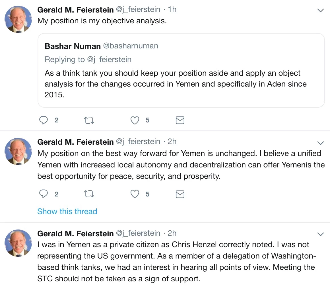 وأضاف فايرستاين في تغريدات على صفحته بموقع تويتر إنه ومن معه من محللين يمثلون مركز أبحاث في واشنطن. وكونهم مهتمون بالشأن اليمني فإنهم بحاجة للاستماع إلى وجهات نظر كافة الأطراف اليمنية لما في ذلك من فائدة لخدمة الموضوعية في تحليلاتهم. وجدد السفير الأميركي الأسبق التأكيد على قناعته بأهمية بقاء اليمن موحدا مع منح المزيد من الاستقلالية للمحافظات والأقاليم وانتهاج المزيد من اللامركزية في حكم اليمن الموحد.