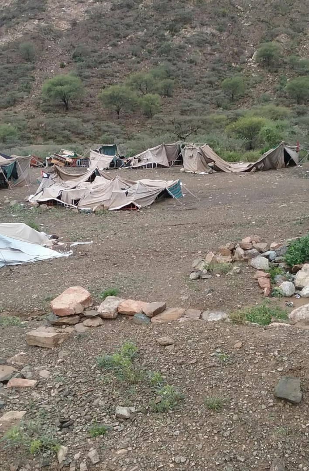وناشد أهالي المنطقة مدير مكتب التربية في المديرية والمحافظة للنزول إلى موقع المخيم الذي تطاير بسبب الرياح والامطار .