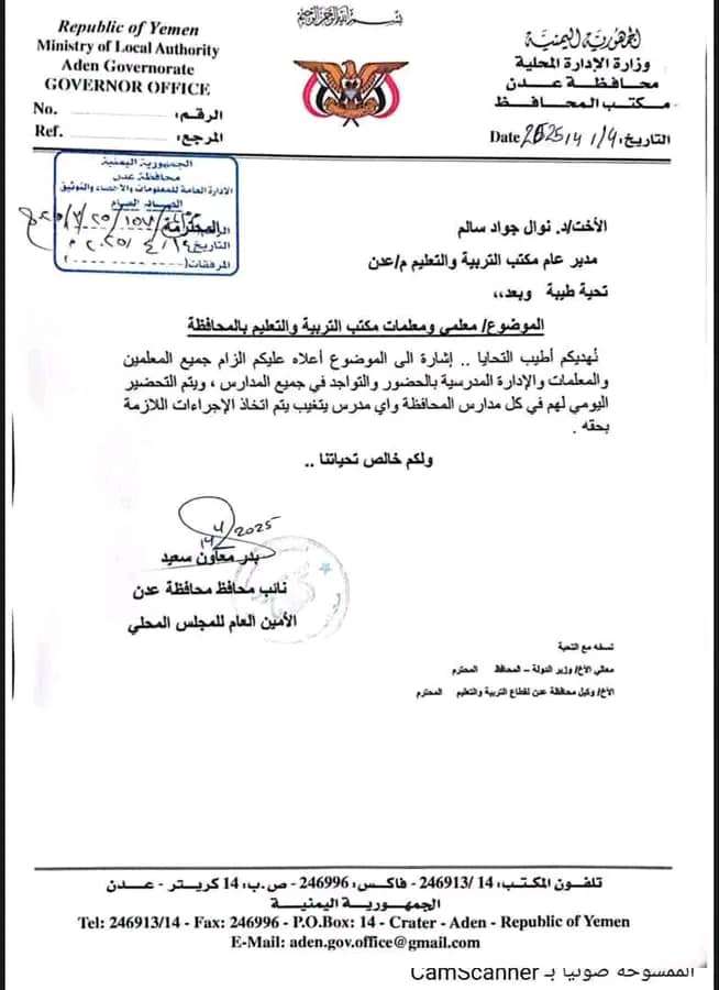 أصدر نائب محافظ العاصمة المؤقتة عدن، الأمين العام للمجلس المحلي بدر معاون سعيد، توجيهًا رسميًا إلى مدير عام مكتب التربية والتعليم بالمحافظة، يقضي بإلزام جميع المعلمين والمعلمات والإدارات المدرسية بالحضور والتواجد في المدارس، والقيام بمهامهم اليومية دون انقطاع.
