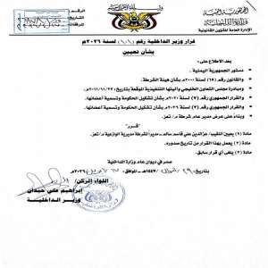 أصدر وزير الداخلية اللواء الركن إبراهيم علي حيدان، قراراً وزارياً يقضي بتعيين قيادة جديدة لإدارة أم...