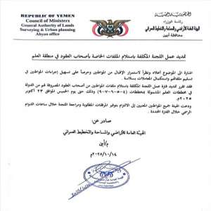 هيئة الأراضي أبين تعلن تمديد فترة عمل لجنة استلام ملفات عقود مخططات العلم