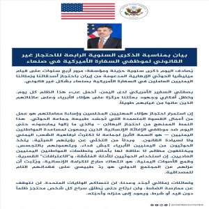 أصدرت السفارة الأمريكية بيانًا رسميًا بمناسبة مرور أربع سنوات على احتجاز جماعة الحوثي المدعومة من إي...