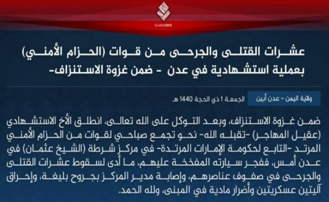 أعلن فرع تنظيم "داعش" في اليمن، اليوم الجمعة، مسؤوليته عن الهجوم الدامي على مركز للشرطة في عدن أمس الخميس.