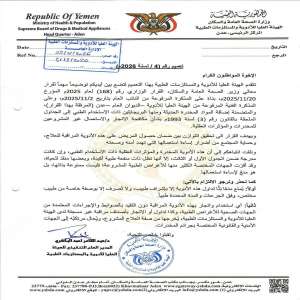 أصدرت الهيئة العليا للأدوية والمستلزمات الطبية – المركز الرئيسي عدن تعميماً هاماً بشأن تنظيم تداول ا...