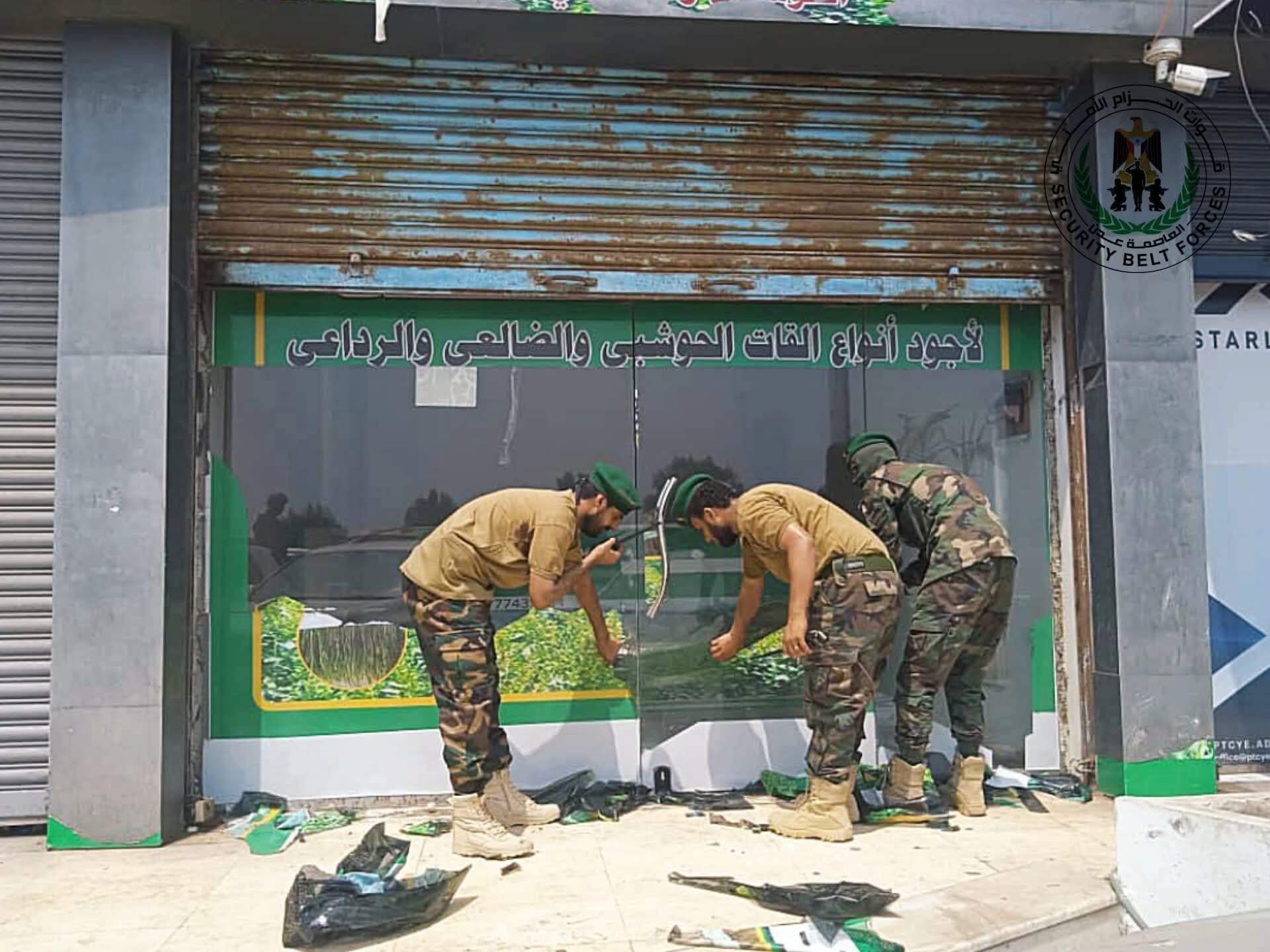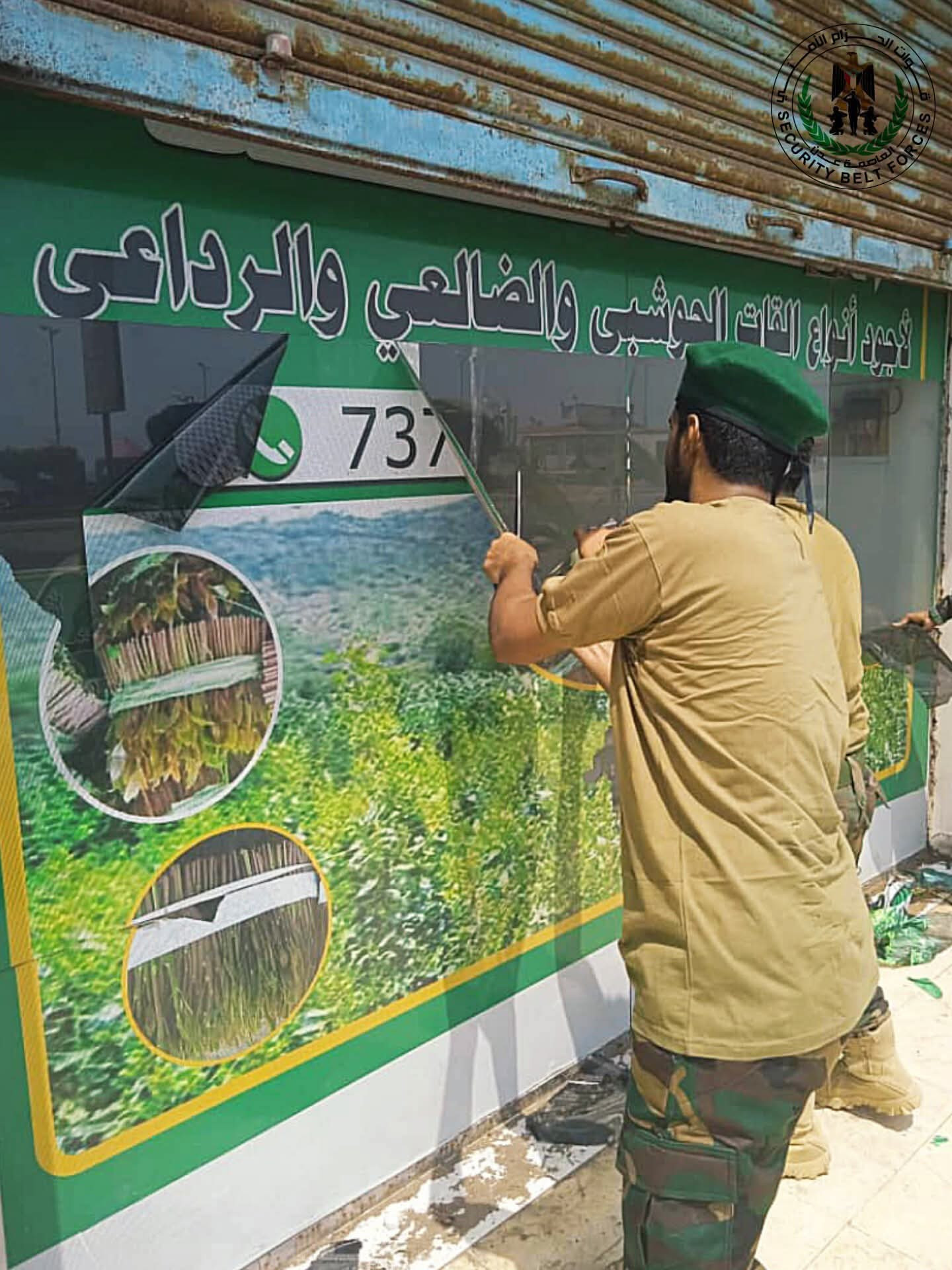 نفذت قوات الحزام الأمني حملة ميدانية في مديرية خور مكسر، أزالت خلالها لوحات الإعلانات الخاصة بمحلات بيع القات.