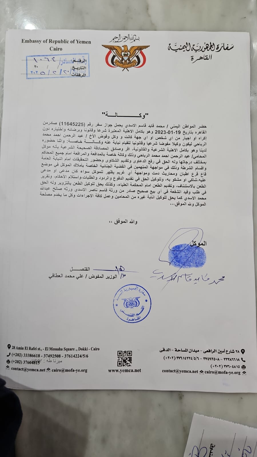 واستجابة لهذا المطلب، تم استكمال الإجراءات والتوجه إلى السفارة لعمل توكيل خاص للمحامي عبدالرحمن الرباحي يخول بمقاضاة الأشخاص المعتدين، وتم تقديمه بتاريخ 30 سبتمبر 2025.