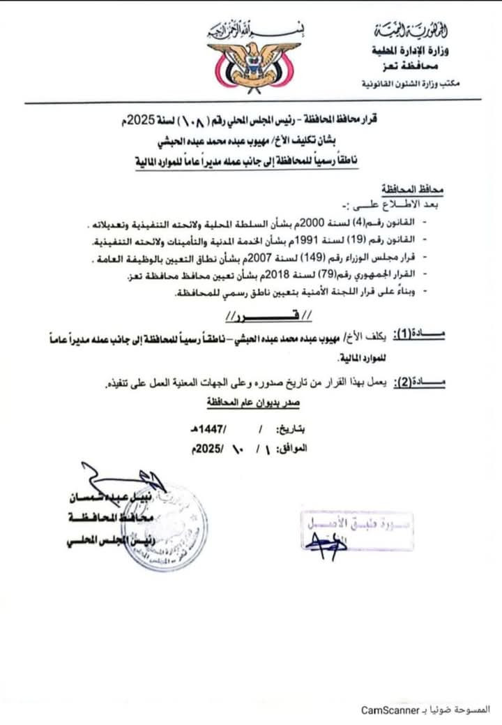 أصدر محافظ محافظة تعز، نبيل شمسان، القرار رقم (108) لسنة 2025م، والذي قضى بـ: