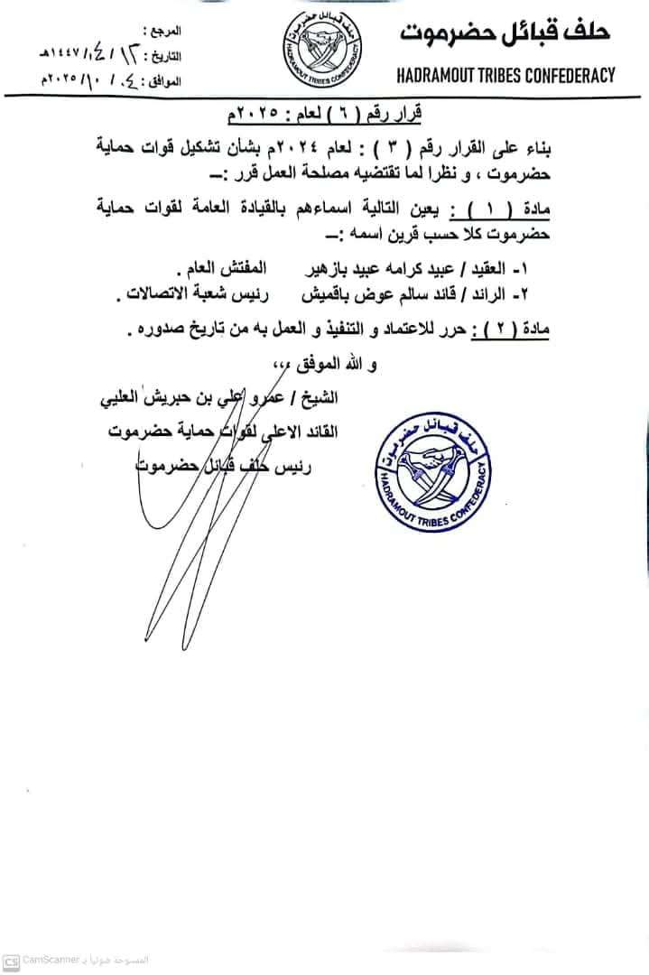 اصدر القائد الأعلى لقوات حماية حضرموت، رئيس حلف قبائل حضرموت، الشيخ عمرو علي بن حبريش العليي، السبت الموافق 4 أكتوبر 2025م، القرار رقم (6) لعام 2025م، قضت مادته الأولى بتعيين التالية أسماؤهم في القيادة العامة لقوات حماية حضرموت، كلٌّ حسب قرين اسمه: