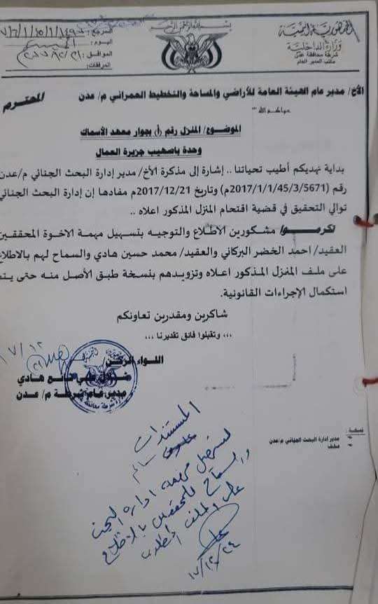 وحسب التوجيه المكتوب فوق الوثيقة، فقد وجه مدير أراضي عدن بتمكين الضابطين من الاطلاع على الملف المطلوب والمستندات المطلوبة.