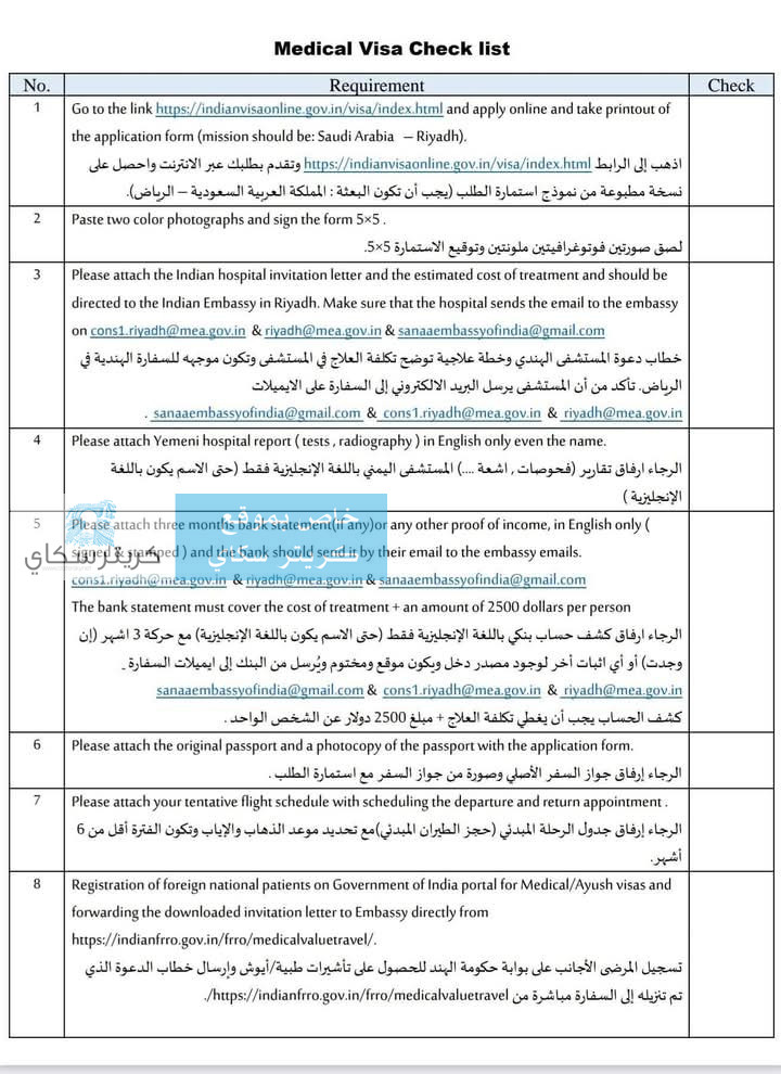 حصل موقع كريتر سكاي على وثائق رسمية توضح متطلبات استخراج الفيزا المرضية للمواطنين اليمنيين عبر المكتب التمثيلي للسفارة الهندية بالعاصمة عدن، والتي بدأ العمل بها مؤخرًا لتسهيل إجراءات السفر للعلاج في الهند.