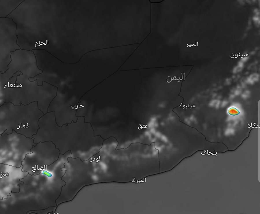 تشهد في هذه الأثناء محافظتا حضرموت ولحج نشاطًا ملحوظًا للسحب الركامية الماطرة، ترافقها عواصف رعدية متفرقة.