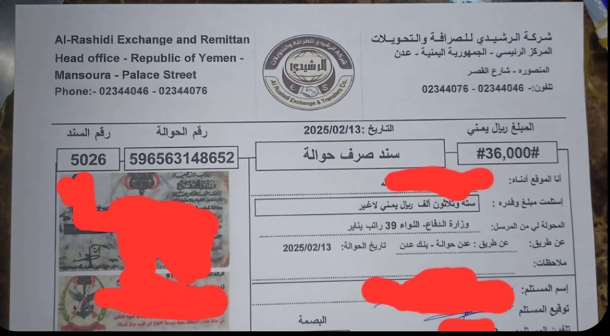 قال الكاتب احمد كرامة:هذا السند قديم ومتجدد ، الخصومات مستمرة بذريعة ان البعض لا يداوم ، كانت 60 الف ريال يمني لجنود الشرعية.