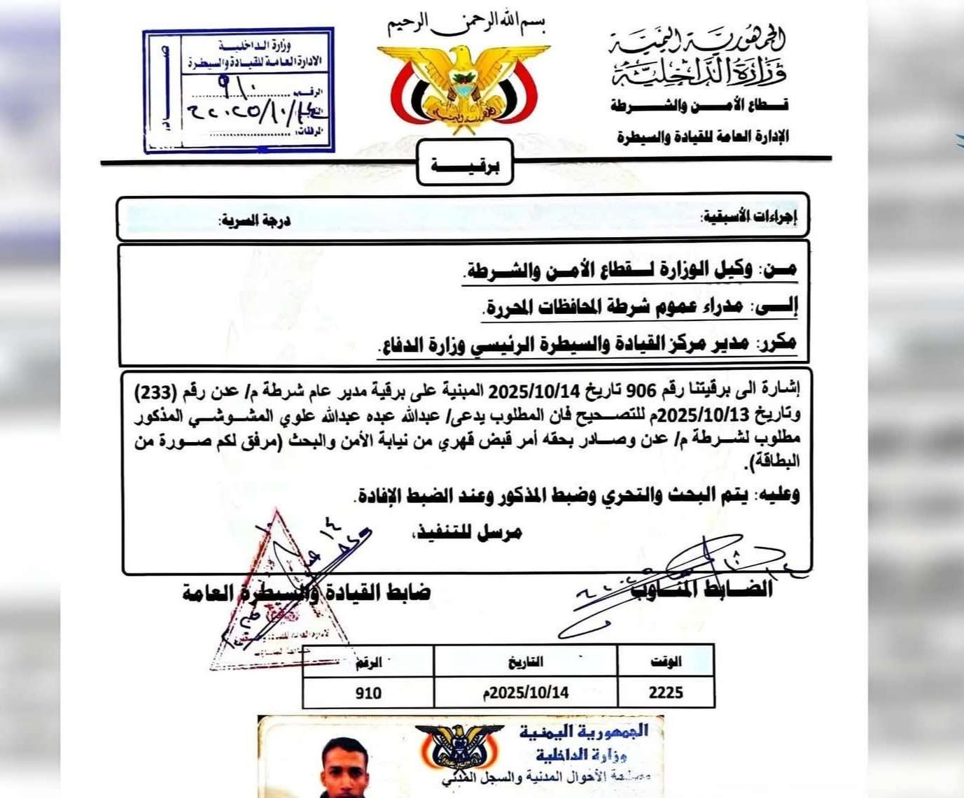 أصدرت وزارة الداخلية – قطاع الأمن والشرطة – أمراً بالقبض القهري على المدعو “ع ع ع،، وذلك بناءً على توجيه من نيابة البحث الجنائي بتاريخ 14 أكتوبر 2025.