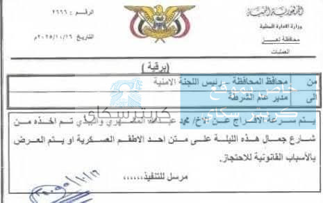 أصدر رئيس اللجنة الأمنية بمحافظة تعز، قبل قليل، توجيهًا يقضي بسرعة الإفراج عن المواطن محمد عبدالله المشهري، ابن عم الشهيدة إفتهان، الذي تم اعتقاله يوم أمس الأربعاء على خلفية حادثة ساحة العدالة.