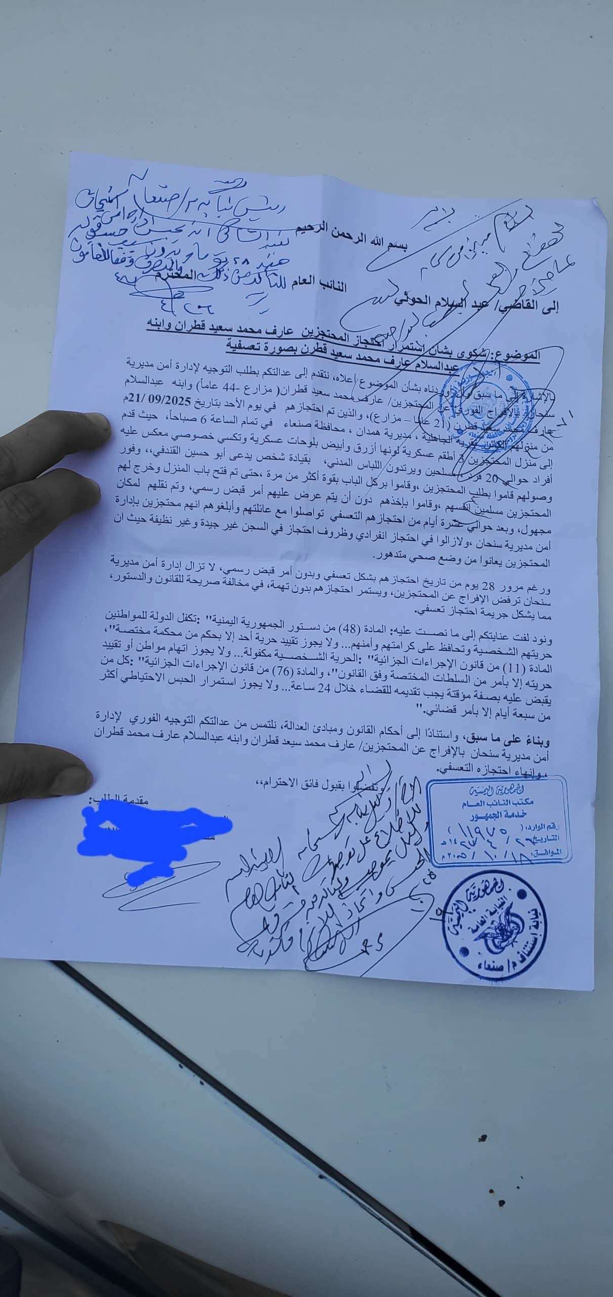 وقد تقدّمتُ وأسرتي بشكوى رسمية إلى النائب العام بصنعاء عبر محامٍ وُقّع الطلب باسمه وتوقيعه، وقد حجبنا اسمه من الصورة المرفقة بناءً على طلبه خوفًا من الملاحقة أو الاعتقال أو تلفيق التهم بعد تلقيه تهديدات صريحة بسبب دفاعه عن المظلومين والمعتقلين دون وجه حق.