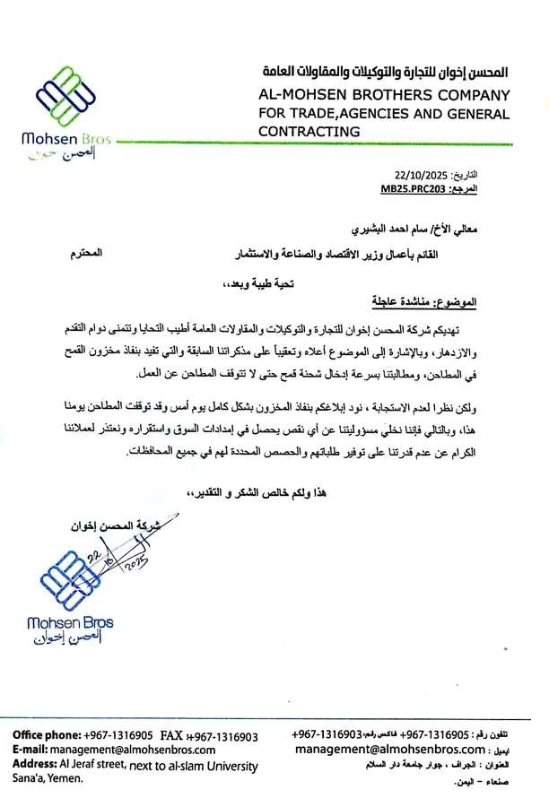 وقالوا إن رفض وزارة الحوثي إدخال شحنة قمح ينذر بشلل تام في إمدادات السوق المحلية وعجز عن تلبية احتياجات المحافظات الواقعة تحت سيطرة الحوتي .