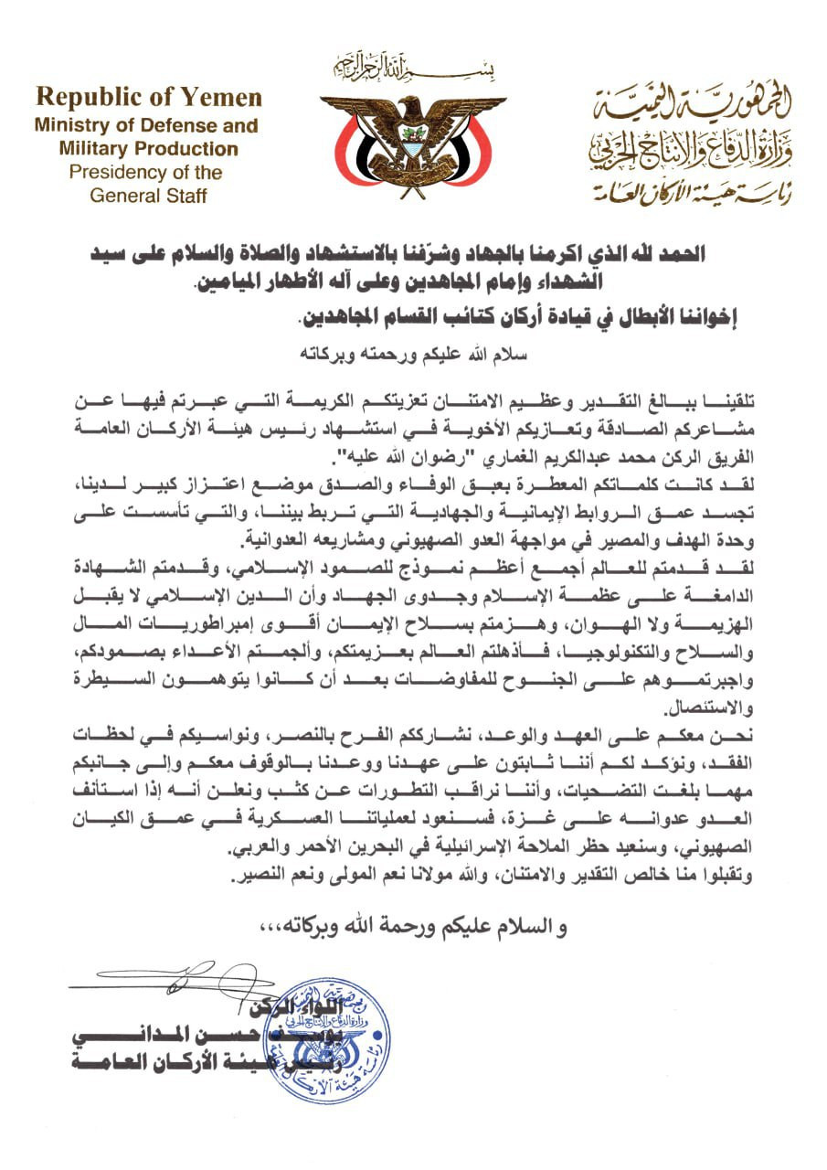 وجه رئيس هيئة أركان مليشيا الحوثي يوسف المداني رسالة إلى قيادة أركان كتائب القسام