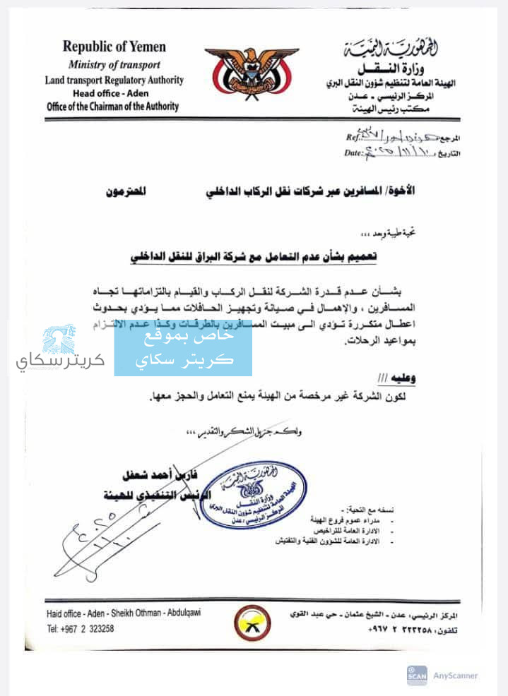 اصدر رئيس الهيئة العامة لتنظيم النقل قرارا بعدم التعامل مع شركة البراق للنقل الجماعي الداخلي
