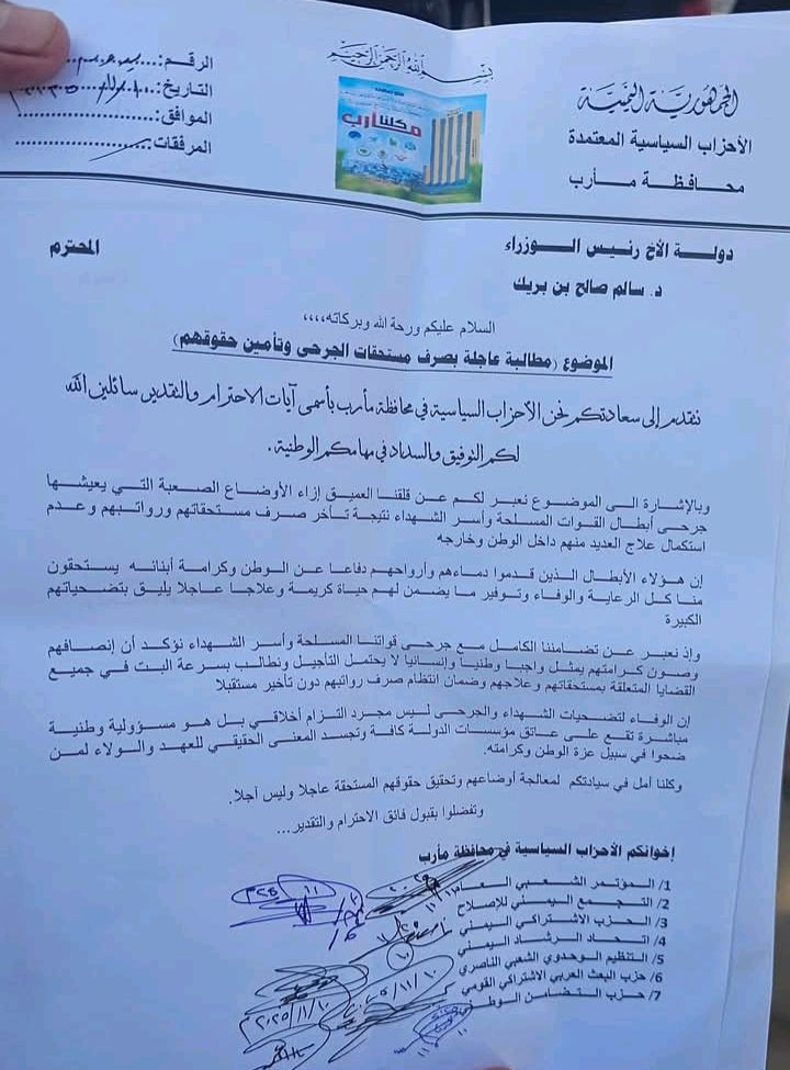 وأصدرت القيادات بيانًا مشتركًا دعت فيه رئيس المجلس الرئاسي الدكتور رشاد العليمي ورئيس الحكومة أحمد عوض بن مبارك إلى سرعة الاستجابة لمطالب الجرحى المشروعة، وصرف مستحقاتهم المالية.