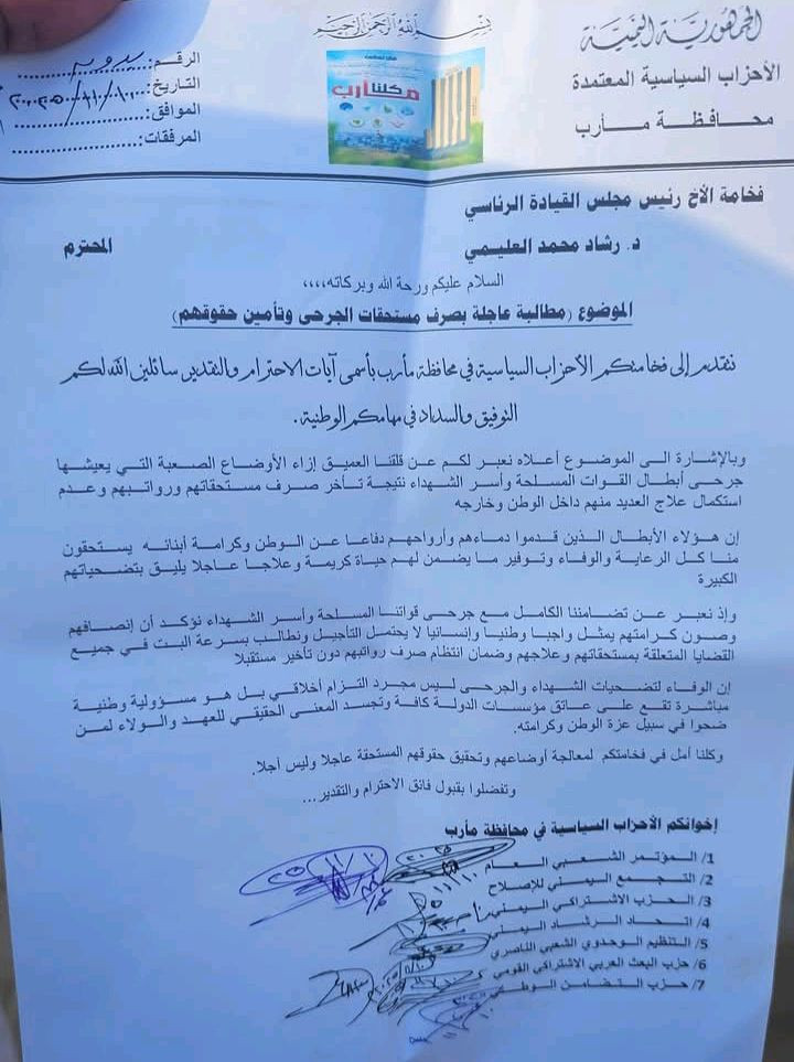 قامت قيادة الأحزاب والتنظيمات السياسية في محافظة مأرب، بزيارة إلى خيام اعتصام الجرحى أمام مكتب الرعاية الاجتماعية، حيث أعلنت تضامنها الكامل مع مطالب الجرحى وأسر الشهداء.