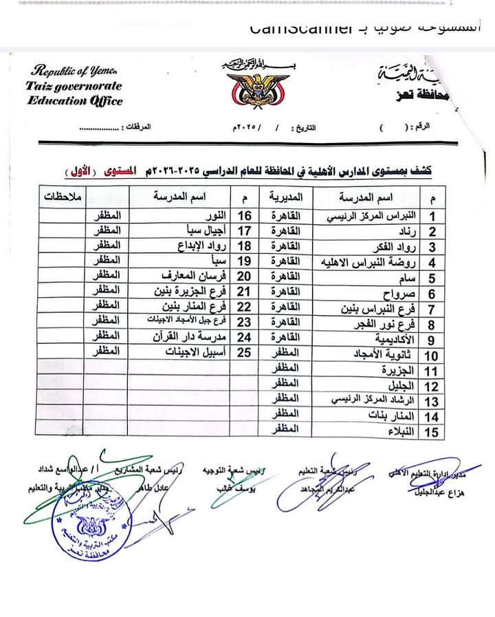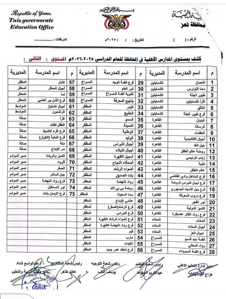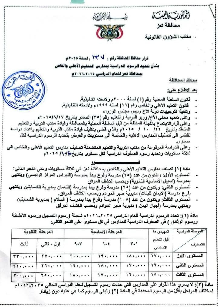 أصدر محافظ محافظة تعز القرار رقم (137) لسنة 2025، بشأن تحديد رسوم التسجيل والأنشطة في مدارس التعليم الأهلي والخاص بالمحافظة.