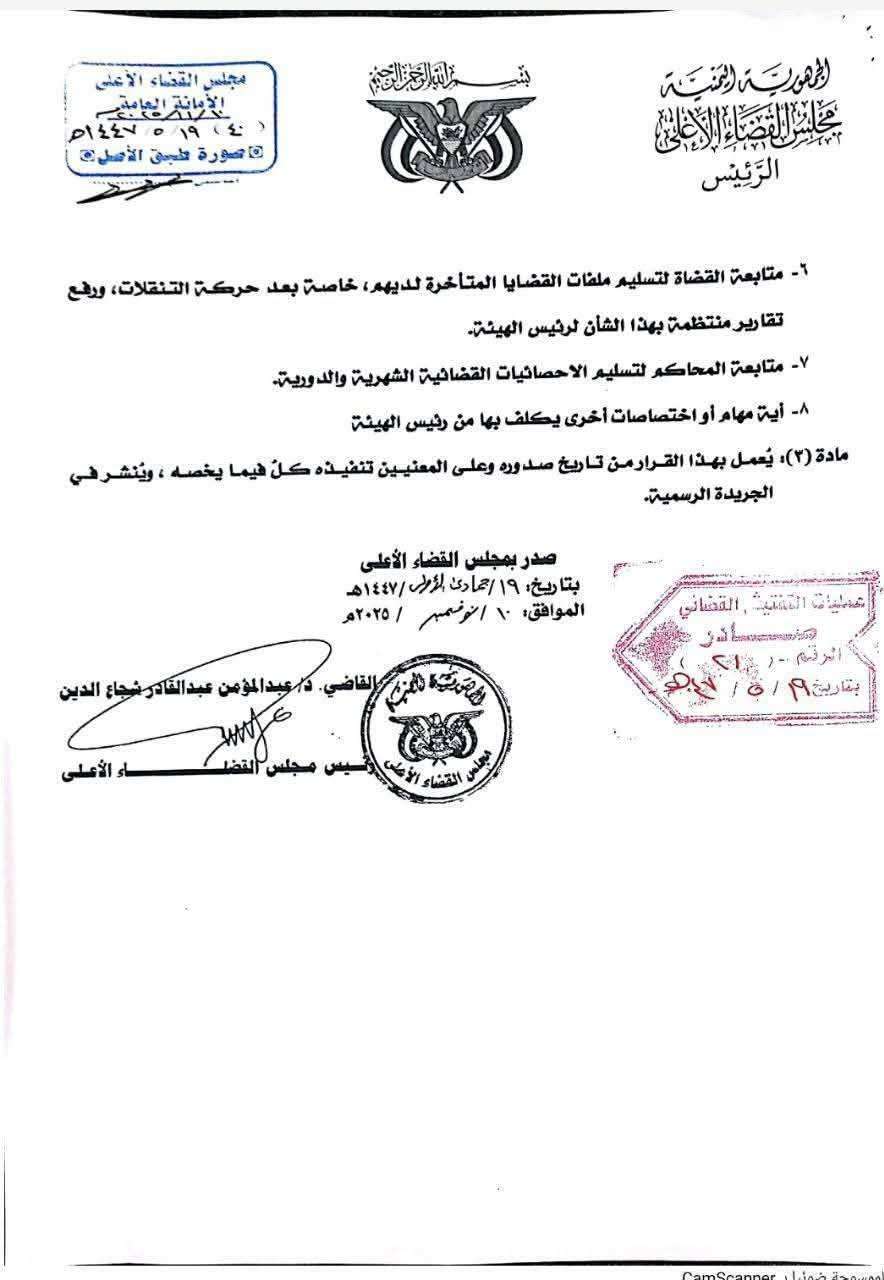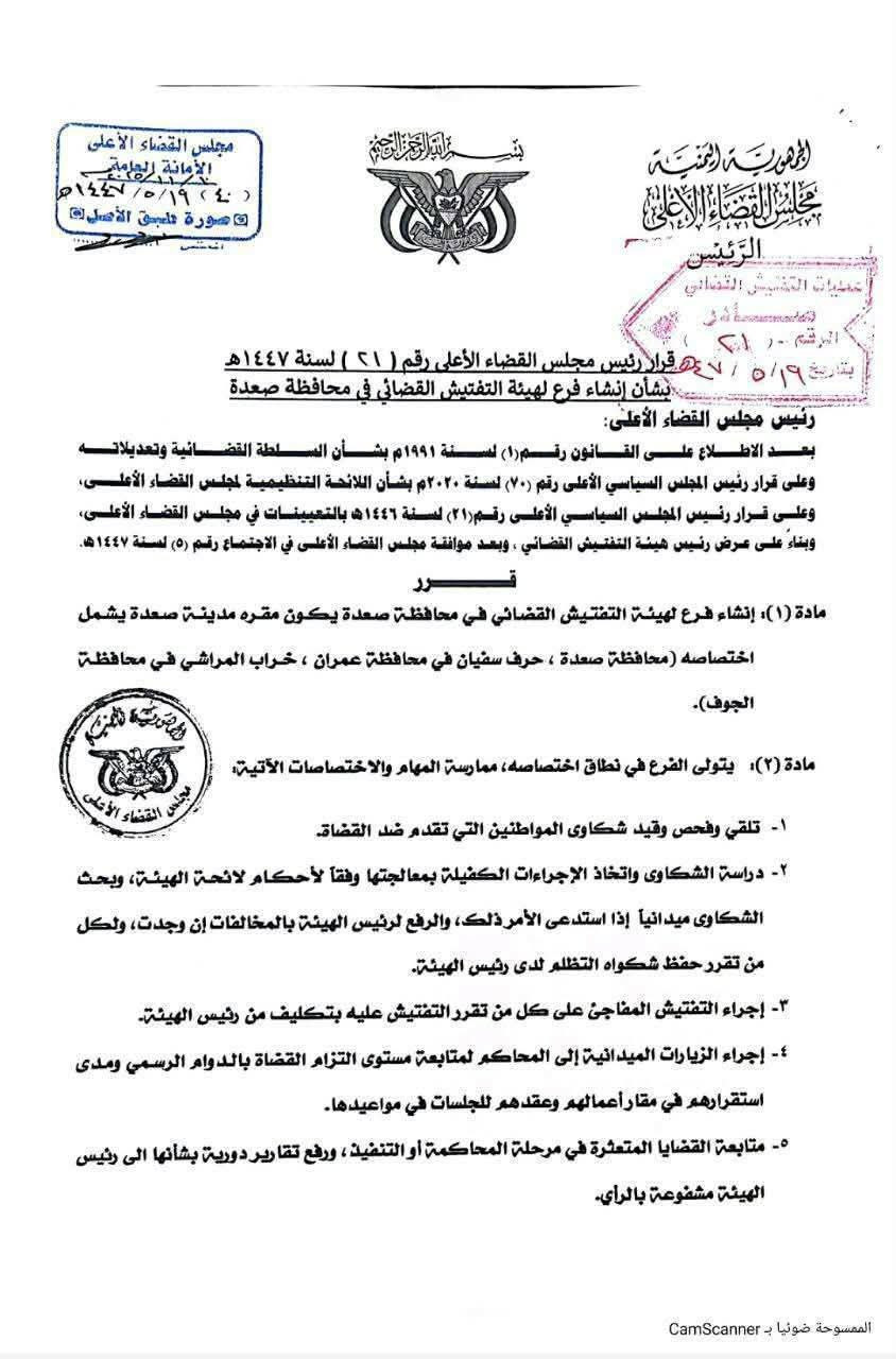 قرار رقم (٤٤) لسنة ١٤٤٧هـ (الصورة المرفقة): بشأن إنشاء فرع لهيئة التفتيش القضائي في محافظة صعدة، ويحدد اختصاصاته ومنها: