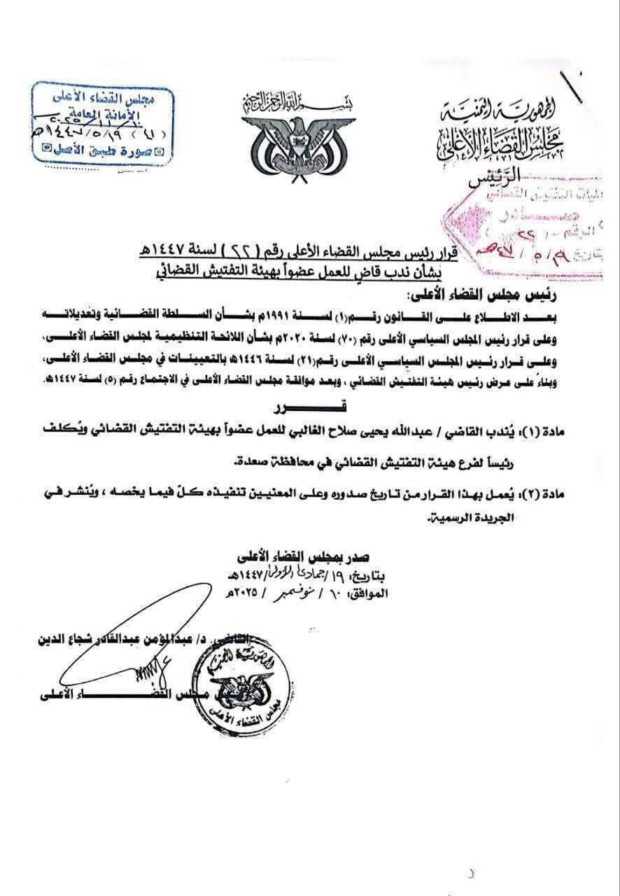 قرار رقم (٤٦) لسنة ١٤٤٧هـ (الصورة المرفقة): ندب القاضي / عبدالله يحيى صلاح الغالبي للعمل عضواً بهيئة التفتيش القضائي ويكلف رئيساً لفرع هيئة التفتيش القضائي في محافظة صعدة.