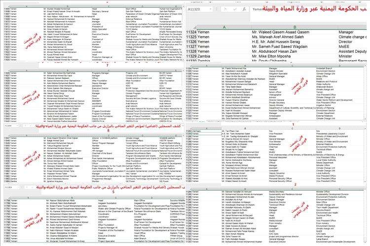 كشف الأكاديمي د. عبدالقادر الخراز عن قوائم تضم نحو 140 اسمًا من المسجلين لحضور مؤتمر المناخ في البرازيل عبر وزارة المياه والبيئة اليمنية، موزعين على ثمانية كشوفات مرقمة، وتتضمن كل قائمة اسم الموظف ومنصبه ووظيفته.
