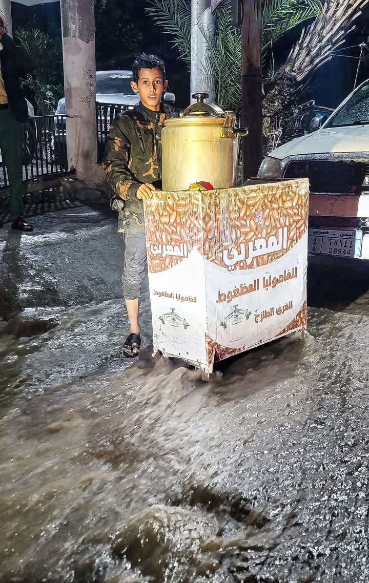 رصدت صورة مؤثرة لطفل في مدينة تعز وهو يبيع الفاصوليا المضغوطة تحت زخات المطر، مساء الاثنين، أمام فندق سنان.