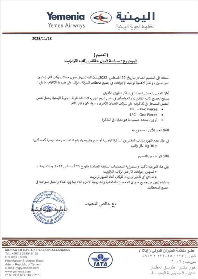 أصدرت شركة الخطوط الجوية اليمنية تعميمًا جديدًا يخص المسافرين من فئة "الترانزيت"، شددت فيه على ضرورة التقيّد بسياسات الوزن المسموح به للأمتعة