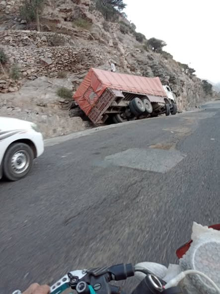 وبحسب مصادر محلية، فإن الشاحنة فقدت توازنها نتيجة المنحدر الحاد وسوء حالة الطريق، دون تسجيل أي إصابات بين السائقين والمارين.