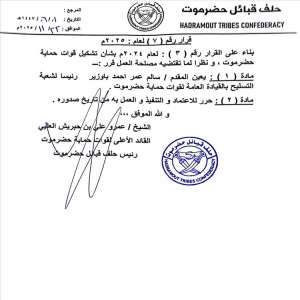 أصدر القائد الأعلى لقوات حماية حضرموت، رئيس حلف قبائل حضرموت، الشيخ عمرو علي بن حبريش العليي، اليوم...