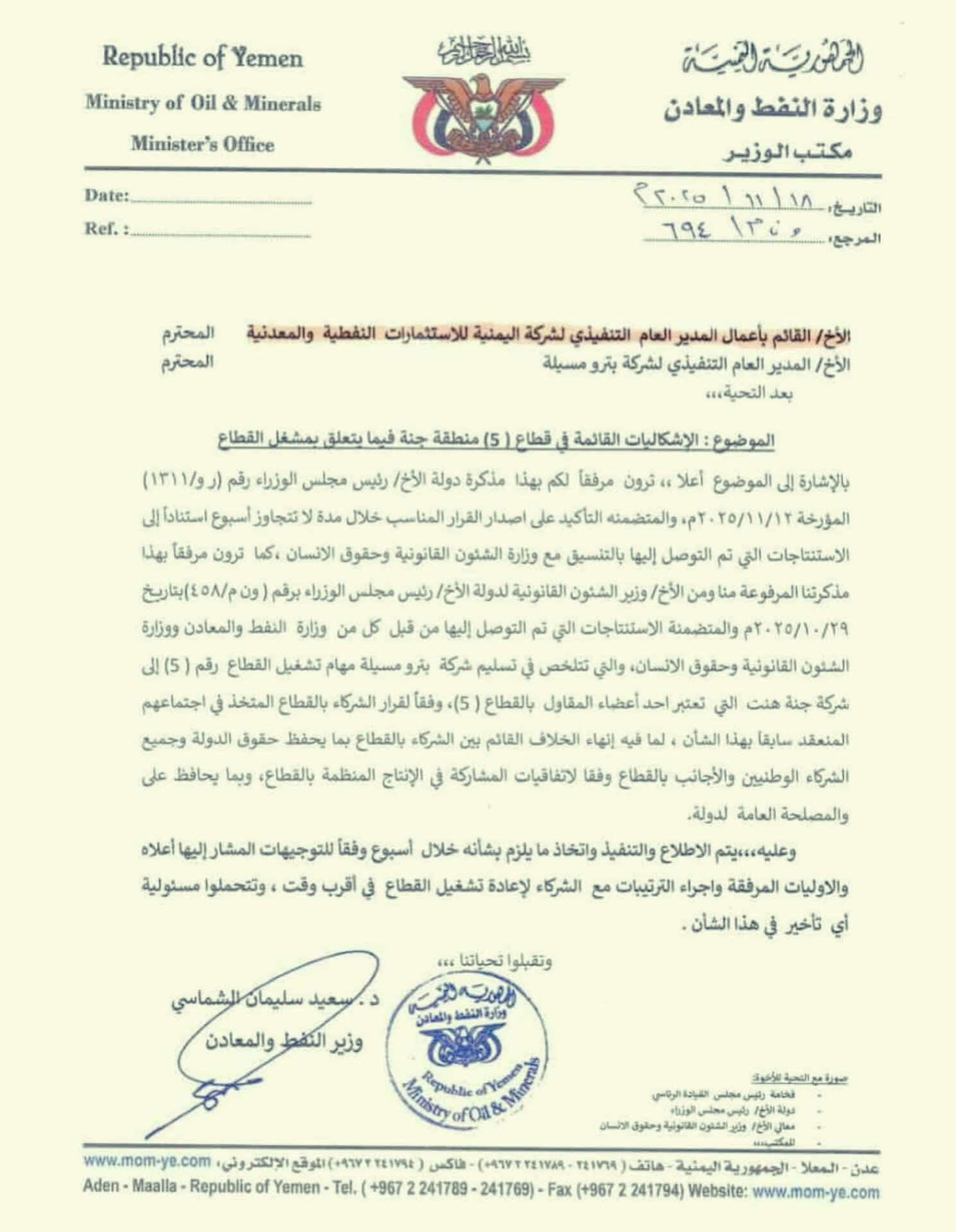 حذر وزير النفط من أي تأخير في تسليم قطاع 5 بشبوة إلى شركة جنة هنت