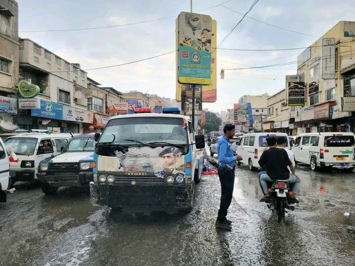 حيث تداول ناشطين في محافظة تعز صورة لأحد رجال المرور وهو يؤدي عمله في تنظيم حركة السير بين المطر والبرد القارس.