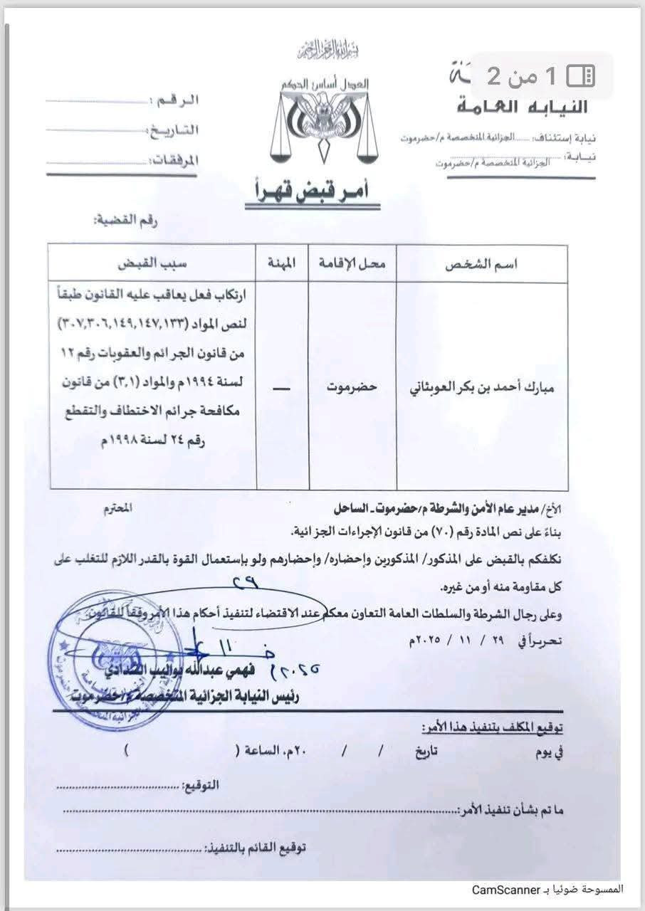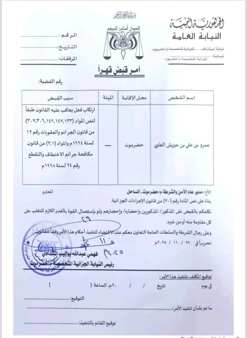 أصدر رئيس النيابة الجزائية المتخصصة بمحافظة حضرموت أوامر قبض قهرية بحق عمرو بن حبريش ومبارك العوبثاني مع تكليف مدير أمن ساحل حضرموت بتنفيذ القرار