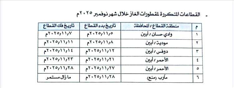 صرّح مصدر مسؤول في الشركة اليمنية للغاز أن الأزمة الراهنة في عدم توفر الغاز في العاصمة عدن تعود بشكل أساسي إلى القطاعات القبلية المتكررة في محافظتي مأرب وأبين، وفي المواقع المحددة بالجدول المرفق، والتي تسبب خلال الشهر الماضي في تعطيل حركة قاطرات الغاز وتقييد وصول الإمدادات إلى عدن و المحافظات المجاورة.