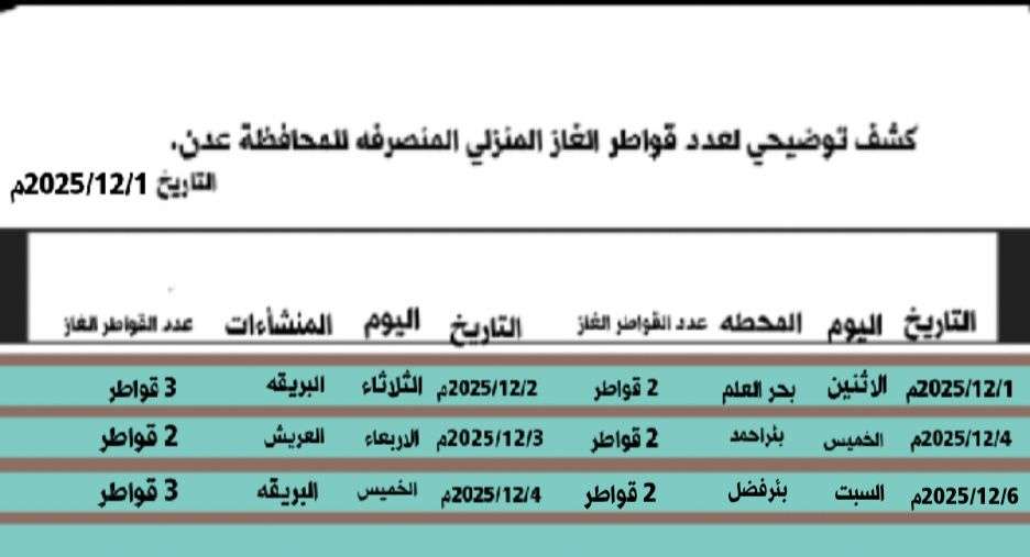 أصدرت الشركة اليمنية للغاز كشفًا توضيحيًا لعمل محطات الغاز المركزية المخصّصة لتعبئة أسطوانات الغاز المنزلي للمواطنين في العاصمة عدن، وذلك ضمن برنامج التوزيع الرسمي الذي يتم عبر مسوّقي الغاز المنزلي في مختلف المديريات، ابتداءً من 1 ديسمبر 2025.