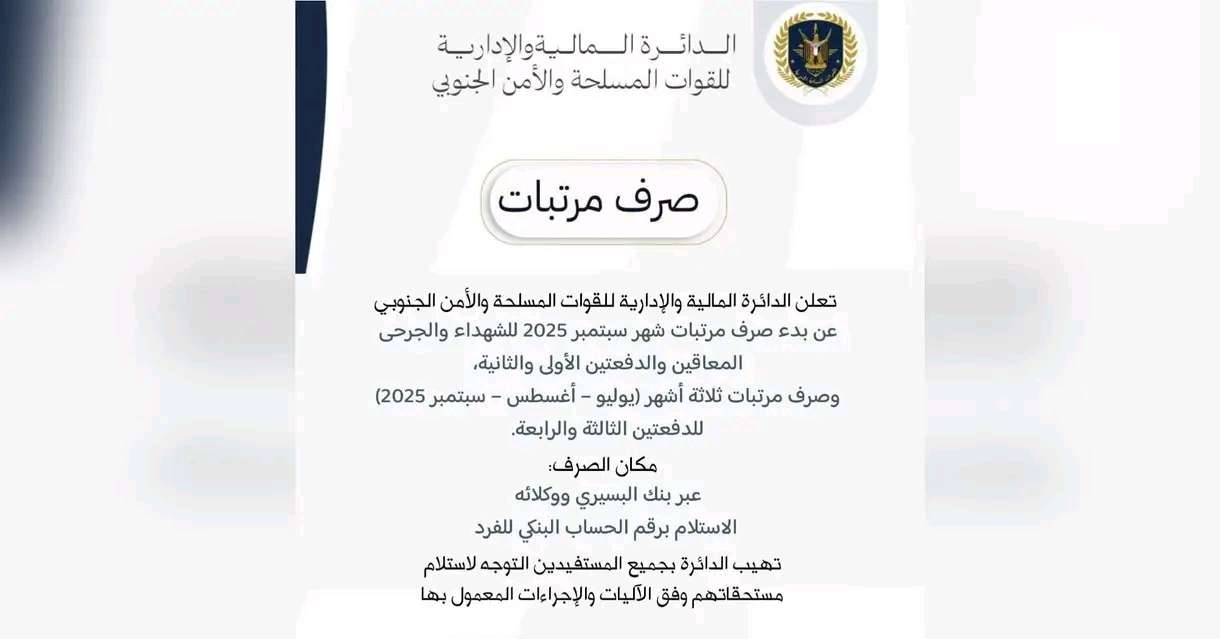 أعلنت الدائرة المالية والإدارية للقوات المسلحة والأمن الانتقالي، الأربعاء، بدء صرف مرتبات شهر سبتمبر 2025 للشهداء والجرحى المعاقين والدفعتين الأولى والثانية من منتسبيها.