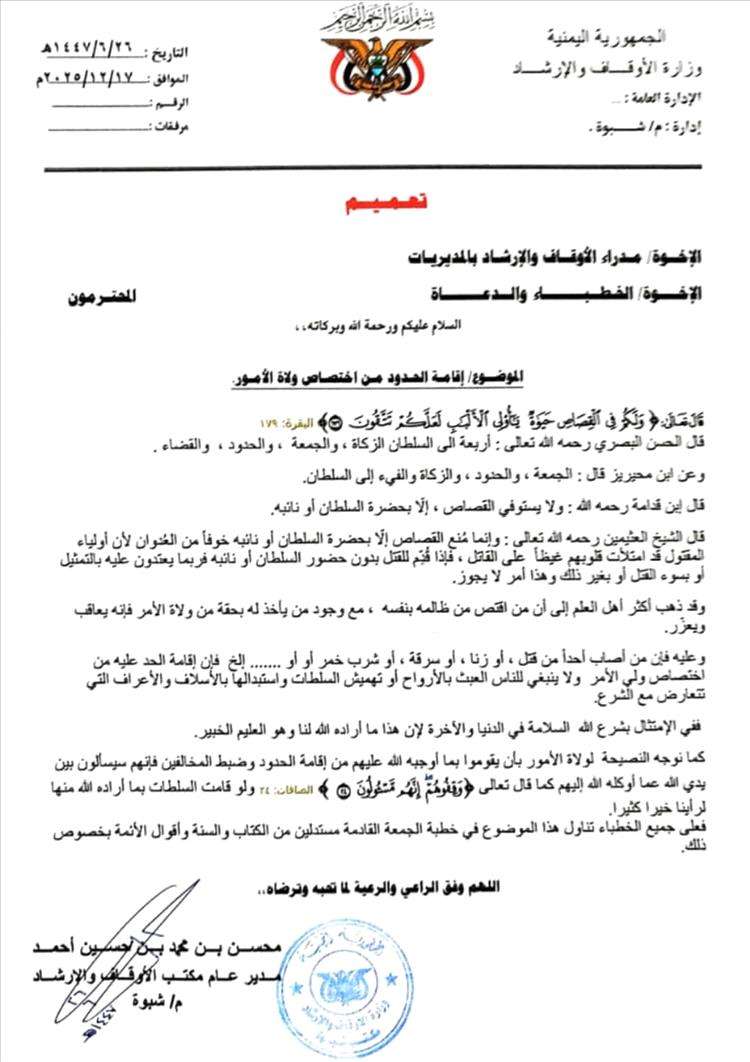 وقال مدير عام مكتب الأوقاف والإرشاد بالمحافظة، محسن بن محمد بن حسين أحمد، في تعميم وُجّه إلى مدراء الأوقاف في المديريات والخطباء والدعاة، إن الشرع الإسلامي نصّ بوضوح على أن الزكاة والجمعة والحدود والقضاء من مهام السلطان، مستشهدًا بعدد من الآيات القرآنية وأقوال كبار العلماء والأئمة في هذا الشأن.