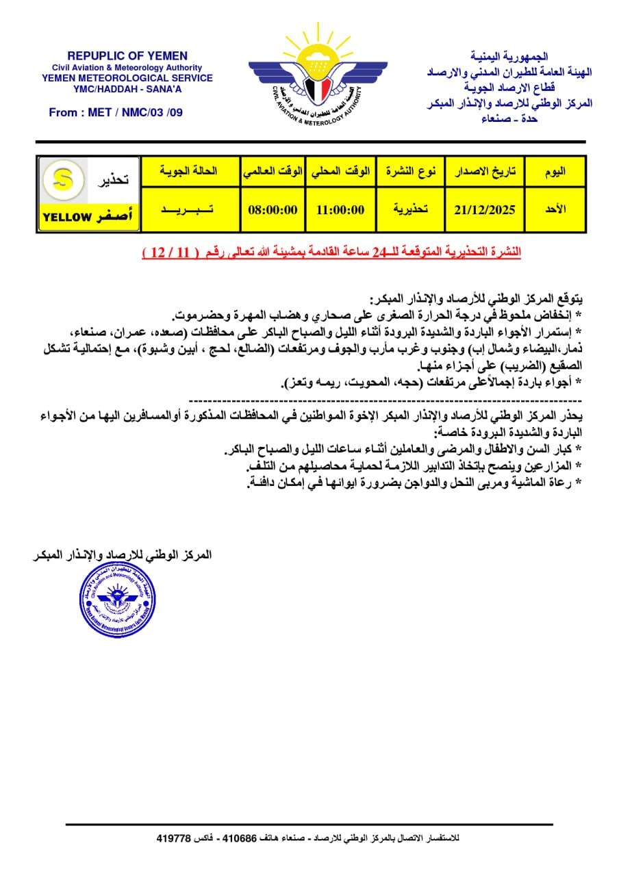 وأشار المركز في نشرته الجوية إلى انخفاض ملحوظ في درجات الحرارة الصغرى بصحارى وهضاب المهرة وحضرموت، مع استمرار البرودة الشديدة ليلًا وصباحًا في محافظات صعدة، عمران، صنعاء، ذمار، البيضاء، شمال إب، جنوب وغرب مأرب، الجوف، ومرتفعات الضالع، لحج، أبين وشبوة، مع احتمال تشكّل الصقيع (الضريب) في أجزاء منها.