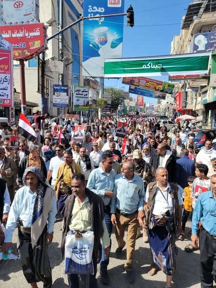 شهد شارع جمال في مدينة تعز، اليوم، مسيرة جماهيرية كبرى تقدّمت باتجاه جامع السعيد لأداء صلاة الجنازة على ضحايا التفجير الإرهابي الذي استهدف محيط مقر حزب الإصلاح.