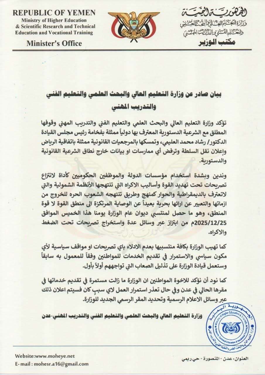 أصدرت وزارة التعليم العالي والبحث العلمي والتعليم الفني والتدريب المهني بيانًا رسميًا اليوم، أكدت فيه وقوفها المطلق خلف الشرعية الدستورية المعترف بها دوليًا، والمتمثلة بفخامة رئيس مجلس القيادة الرئاسي الدكتور رشاد محمد العليمي.