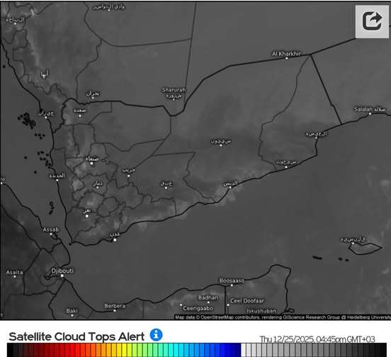 شهدت الأجواء، عصر اليوم الخميس 25 ديسمبر 2025م، انتشارًا واسعًا للسحب فوق السواحل الشرقية والجنوبية، ومرتفعات تهامة حتى غرب صعدة.