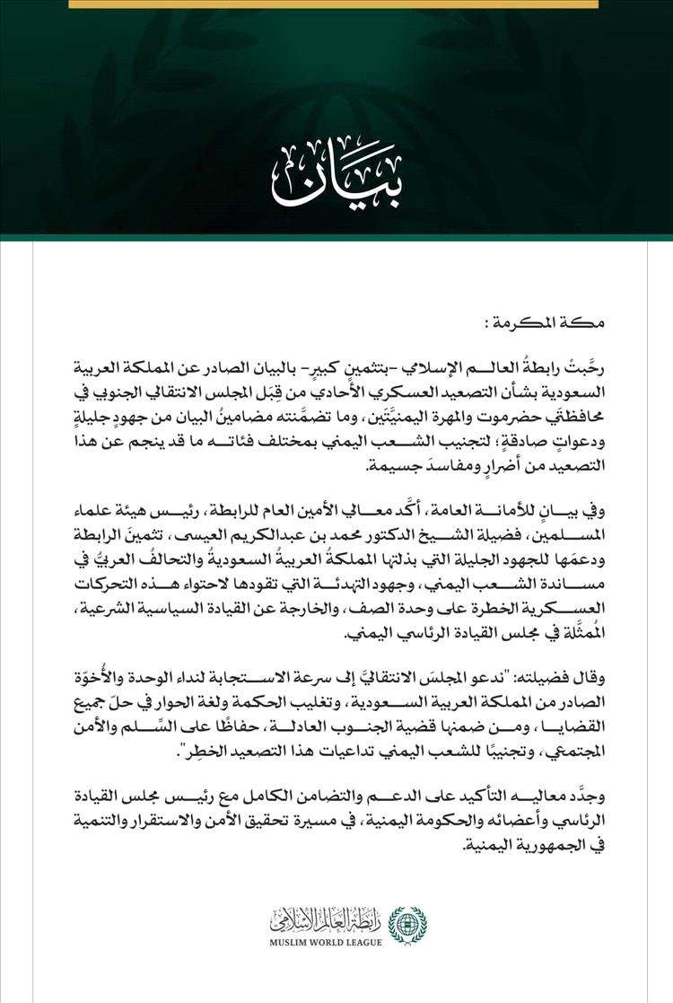 أعربت رابطة العالم الإسلامي عن ترحيبها وتثمينها الكبير للبيان الصادر عن المملكة العربية السعودية بشأن التصعيد العسكري الأحادي من قبل المجلس الانتقالي الجنوبي في محافظتي حضرموت والمهرة اليمنيتين. وأكدت الرابطة دعمها الكامل لما تضمنه البيان من جهود جليلة ودعوات صادقة تهدف إلى تجنيب الشعب اليمني بمختلف فئاته الأضرار والمفاسد الجسيمة الناتجة عن هذا التصعيد.