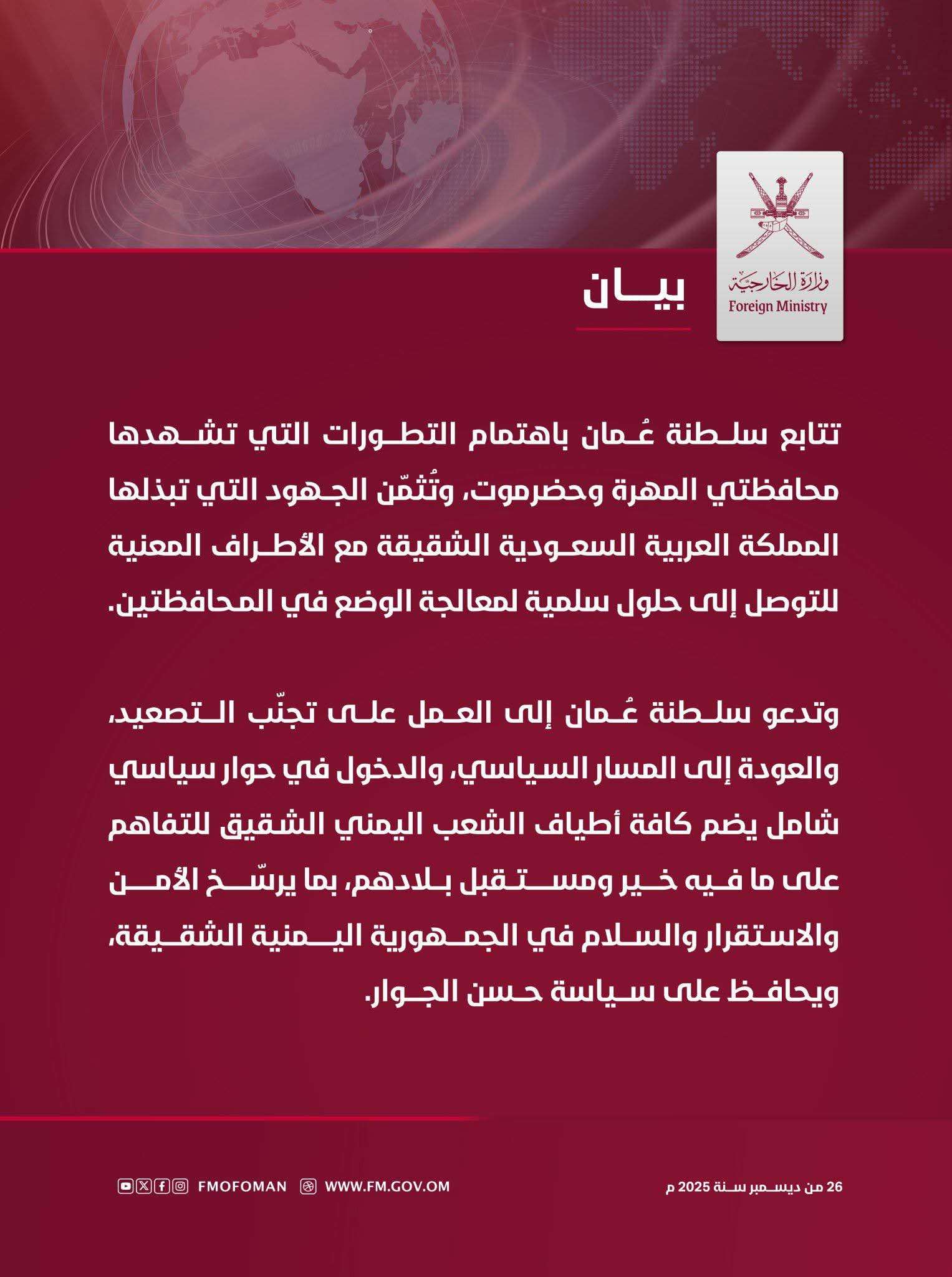 أصدرت وزارة الخارجية العمانية بياناً أكدت فيه متابعة السلطنة باهتمام بالغ للتطورات الأخيرة التي تشهدها محافظتا المهرة وحضرموت اليمنيتان. وأعربت الوزارة عن تثمين سلطنة عُمان للجهود التي تبذلها المملكة العربية السعودية مع الأطراف المعنية بهدف التوصل إلى حلول سلمية تعالج الوضع الراهن في المحافظتين.