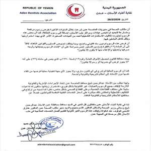 نقابة أطباء الأسنان بعدن ترفض "الجبايات" غير القانونية وتحذر من انهيار العيادات وتضرر المرضى