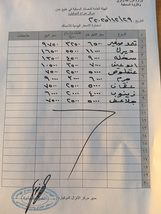 أعلنت الهيئة العامة للمصائد السمكية في العاصمة عدن، اليوم الاثنين ٢٩ ديسمبر ٢٠٢٥م، عن استقرار نسبي في أسعار الأسماك، مع تسجيل تفاوت بسيط في بعض الأصناف نتيجة تباين كميات العرض والطلب في الأسواق المحلية.